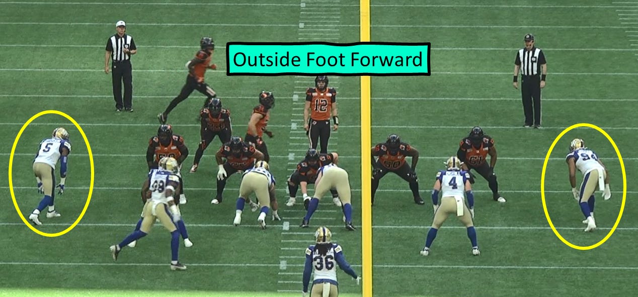In the modern CFL we are seeing less and less Defensive Ends lining up with a “hand in the dirt”. It’s probably more prevalent in that other league down south, where there is no neutral zone and the contact happens faster on the line of scrimmage.