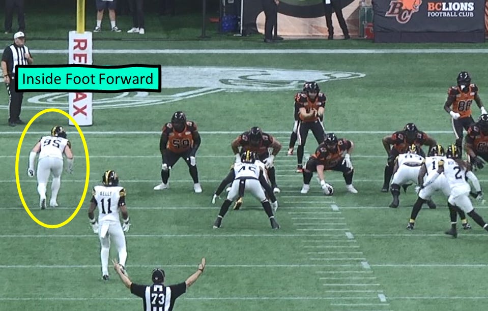 When the INSIDE foot is forward, this again allows for great vision to the outside. In run situations, you’ll want the Defensive End to use a jab step here with the inside foot to attack the Offensive Tackle. If the DE reads reach, they will be in position to have a great second step since their outside foot is back.