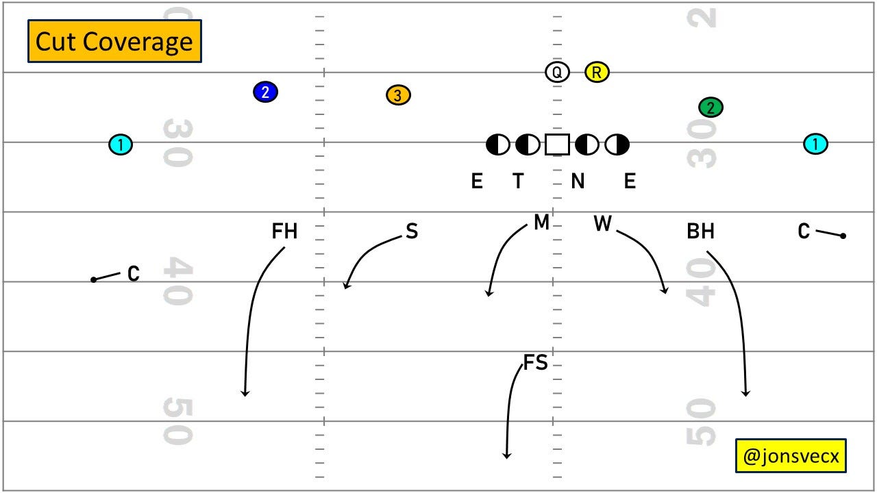 Simply put, Cut Coverage is a Cover 3 Zone Coverage where the Corners are playing a Low Zone, and the Halfbacks are playing a Deep Zone.